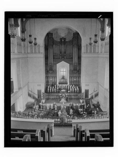 Black and white photograph. View from second floor balcony of the center aisle of the church at Harry Chandler's funeral. Flower draped coffin visible at the head of the aisle, several guests present in the pews. Sue Reeves Collection.