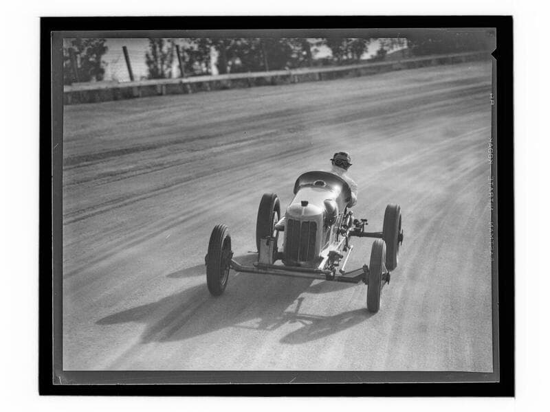 Race car driver Barney Oldfield on track at Legion Ascot Speedway, Los Angeles