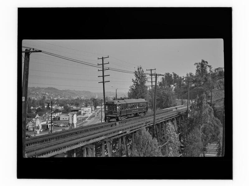 Pacific Electric Railway streetcar no. 5126 on the Van Nuys line seen travelling over a railroad trestle in North Hollywood, in the San Fernando Valley. The sign on the front of the car says "Los Angeles."