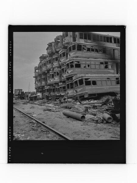 View of old Pacific Electric Railway trolley cars with broken windows stacked in a junkyard on Terminal Island in Los Angeles County, California.