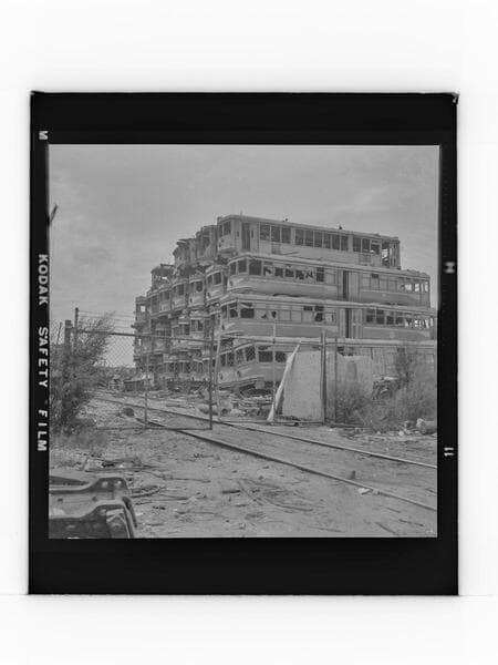 View of old Pacific Electric Railway trolley cars with broken windows stacked in a junkyard on Terminal Island in Los Angeles County, California.