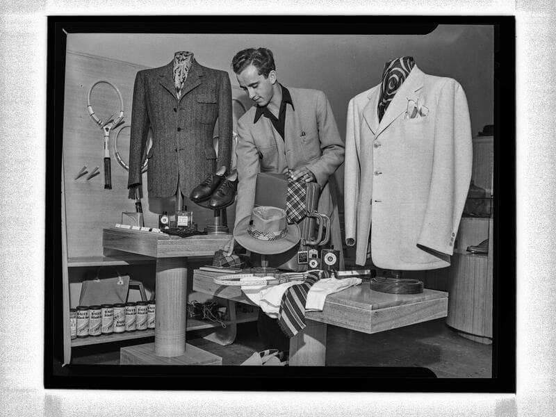 View of the interior of the Corrinne Griffith Shop on Beverly Drive in Beverly Hills, California, showing displays of men's clothing, ties, Kaywoodie pipes, and hats with a sign "Your Fall Hat Sir!."