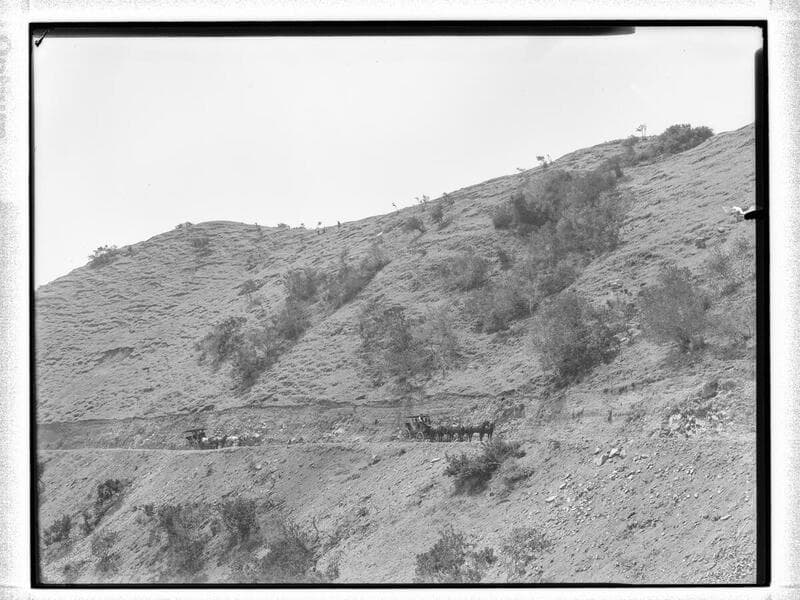 Horse-drawn stagecoaches on a road with people standing on a hill above, Catalina Island