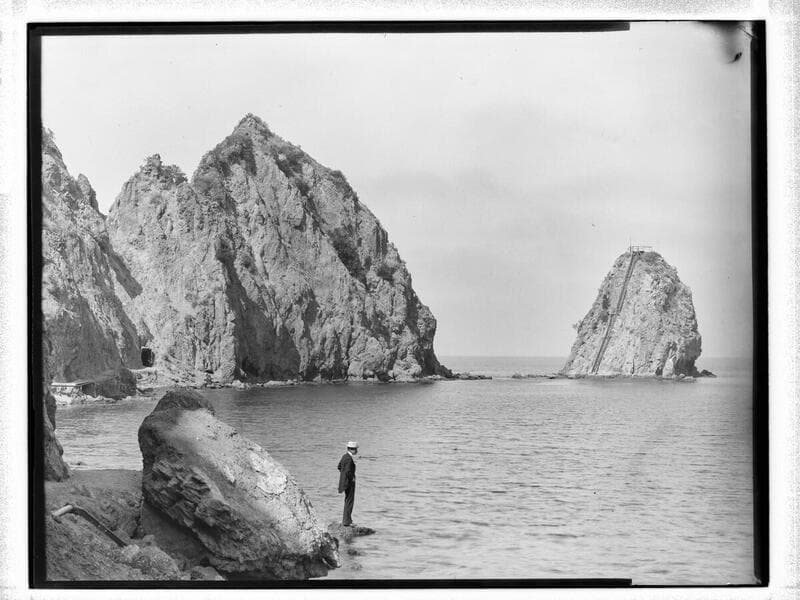 Image of a step ladder installed on Sugar Loaf Rock at Avalon Bay on Santa Catalina Island, California. Signs on the rock read "Climbing on any part of this property is strictly forbidden Santa Catalina Island Co." and above it "Sugar Loaf Rock."