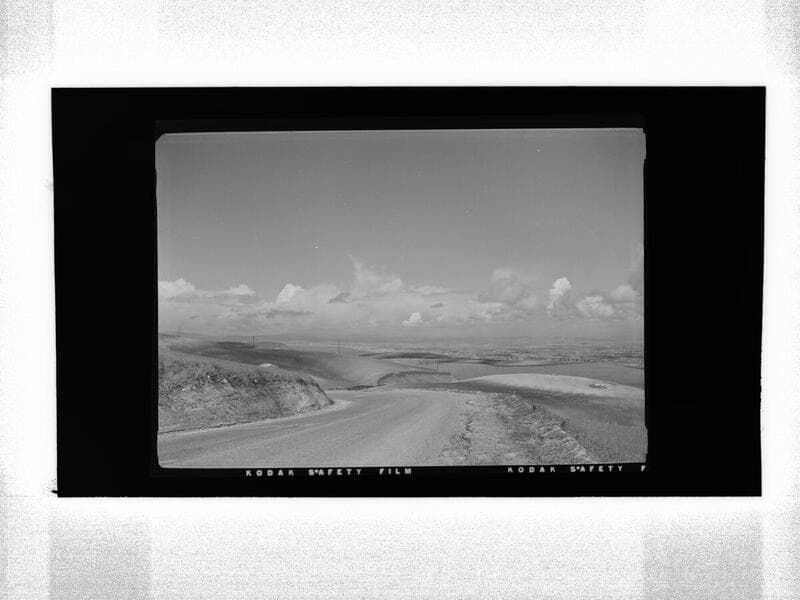 Image of the road and the hills of the Toomey Properties, prior to development, on Palos Verdes Hill in Palos Verdes Estates California, with a sign that reads "Crenshaw Blvd. (temporary)."