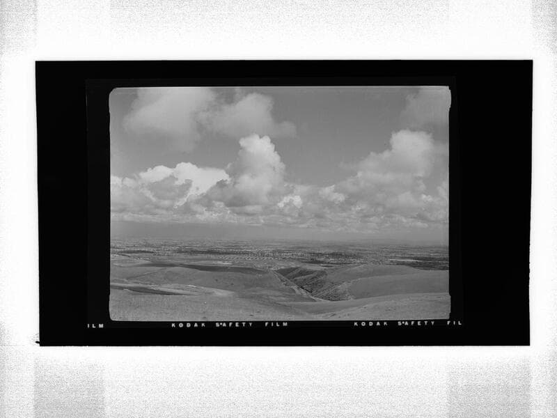Image of the road and the hills of the Toomey Properties, prior to development, on Palos Verdes Hill in Palos Verdes Estates California, with a sign that reads "Crenshaw Blvd. (temporary)."