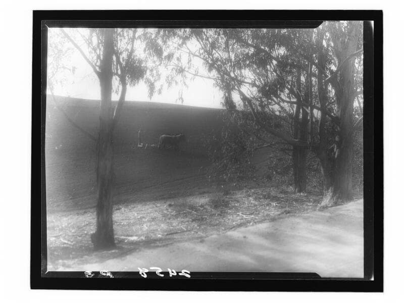 A man stands on a plow being pulled by mules, preparing soil for farming, in Westwood, California.