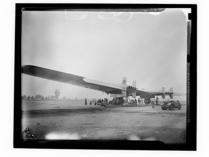 The Northrop YB-49 jet bomber prototype aircraft, also called the "Flying Wing" seen at an unidentified airfield.