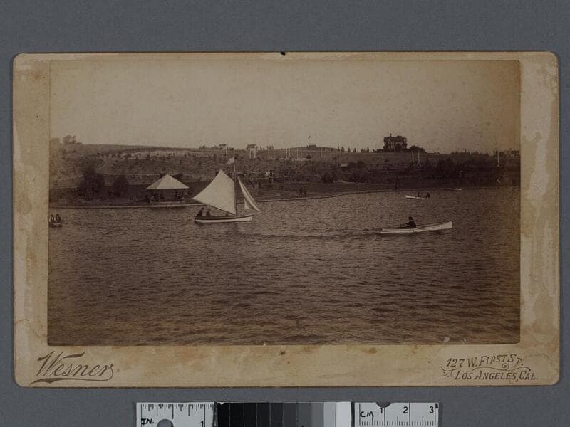 View of canoes, a sailboat, and rowboats on a lake in Westlake Park (now MacArthur Park) in Los Angeles, California, with people in a gazebo in a park, horse-drawn carriages, a streetlight, and large houses visible on the shore.