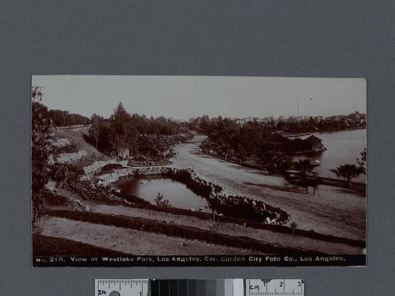 View of a sailboat, rowboat, and canoe on a lake in Westlake Park (now MacArthur Park) in Los Angeles, California, with people in a gazebo in a park and horse-drawn carriages visible on the shore.