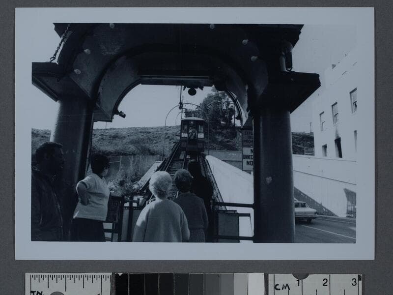 View of passengers getting into a car of the Angels Flight incline railway at the intersection of Hill Street and Third Street in the Bunker Hill neighborhood of downtown Los Angeles, California, with the Pacific Telephone Tower and microwave tower (now the AT&T Tower) visible in the background.