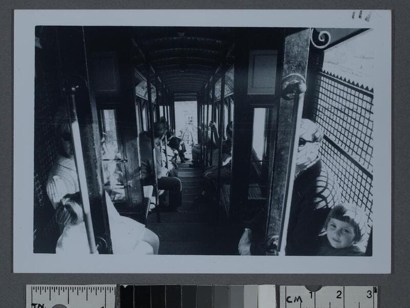 View of passengers getting into a car of the Angels Flight incline railway at the intersection of Hill Street and Third Street in the Bunker Hill neighborhood of downtown Los Angeles, California, with the Pacific Telephone Tower and microwave tower (now the AT&T Tower) visible in the background.