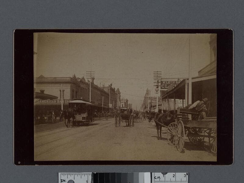 Street view looking north on Main Street in downtown Los Angeles, California, as seen presumably from about the intersection with Requena Street (later Market Street) with the three-story Italianate Temple Block building visible in the background at center left next to two buildings of decreasing height that were also part of the Temple Block, with the two-story building at closest left housing the Wells Fargo & Co. Express office. At right, storefront signs can be seen including a sculpture of a boot with the sign "Boots & Shoes" and an obscured sign including the letters "ne Haba." With a horse-drawn wagon, wooden sidewalk, and dirt road visible.