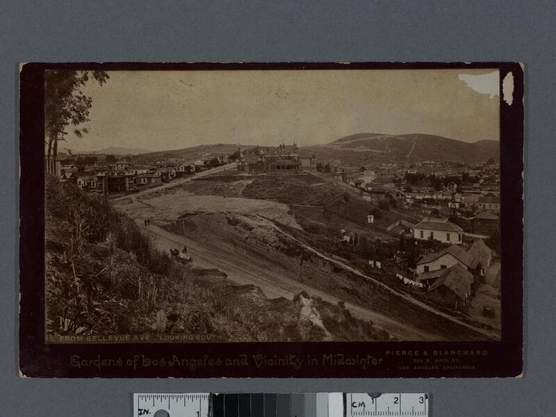 Elevated view of the Plaza district of Los Angeles (also known as Sonora Town) as seen from Fort Hill (also known as Fort Moore Hill), looking north with Buena Vista Street (now North Broadway) at right, and Bellevue Avenue (later Sunset Boulevard and now Cesar E. Chavez Avenue), the first intersecting road below.