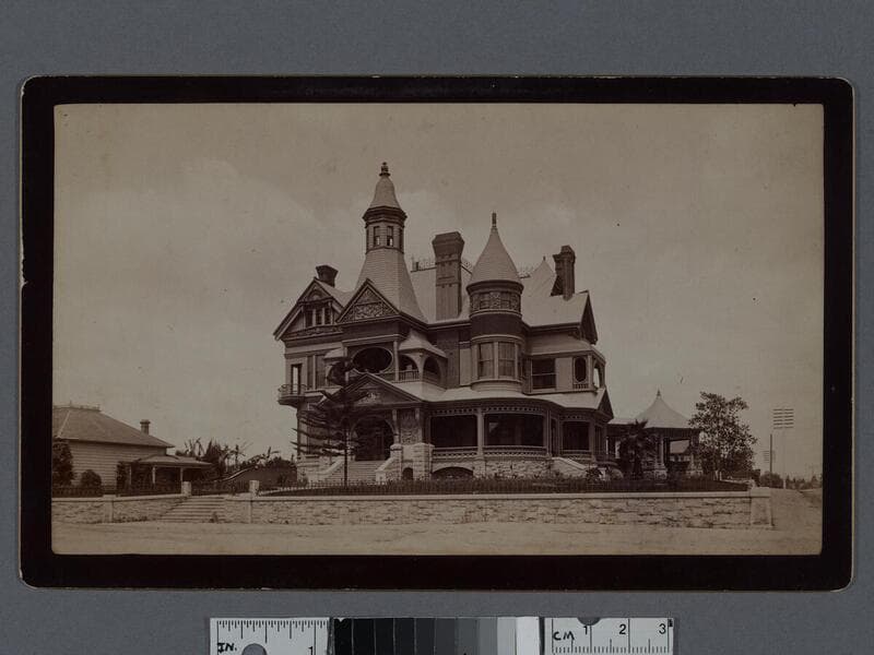 View of the three-story Victorian-style Crocker mansion at 300 South Olive Street as seen from about Hill Street and Third Street in the Bunker Hill neighborhood of Los Angeles.