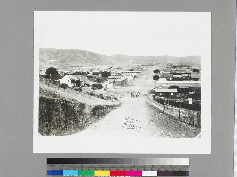 View of the Plaza district of Los Angeles (also known as Sonora Town) as seen from Fort Hill (also known as Fort Moore Hill), looking north with Buena Vista Street (now North Broadway) at right, and Bellevue Avenue (later Sunset Boulevard and now Cesar E. Chavez Avenue), the first intersecting road below.
