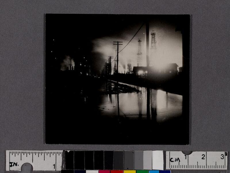 Night view of oil derricks along a street with electrical poles and small buildings or houses. The exact location is undetermined; writing on back of photograph suggests this is possibly Santa Fe Springs (Los Angeles).