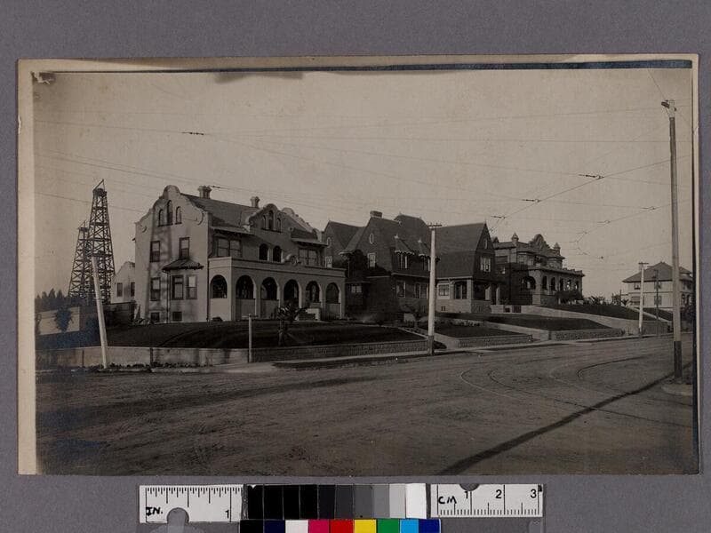 Oil wells and residences on Alvarado Street, Los Angeles