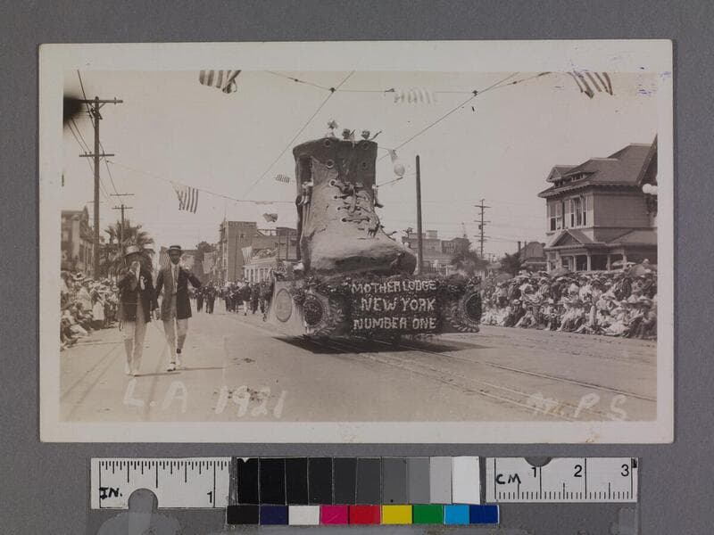 Image of a parade scene on Hill Street between Fifth Street and Sixth Street in downtown Los Angeles, California, showing spectators and people on horseback watching a float showing a cable railway on a mountain. This may be a depiction of the Mount Lowe Railway included in the 1894 La Fiesta de Los Angeles parade. The large building with towers beyond the trees is Hazard's Pavilion (located at Fifth Street and Olive Street) and the Leonard J. Rose Mansion can be seen on the hillside of Bunker Hill.
