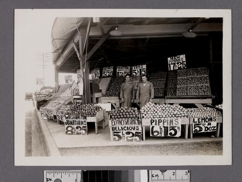 A panoramic view of the Mesa Vernon Market located at 4342 Crenshaw in Los Angeles. In addition to selling fruits, vegetables, meats, and groceries, the market includes a delicatessen, pharmacy, and fountain cafe. There are numerous automobiles parked in the lot outside the market, as well as on the adjacent streets. The open area on the far right is Leimert Park. Writing in white at bottom of image reads "Photo by - C.C. Pierce & Co. ; 10-21-33. 1572 W. Pico Blvd. LA".