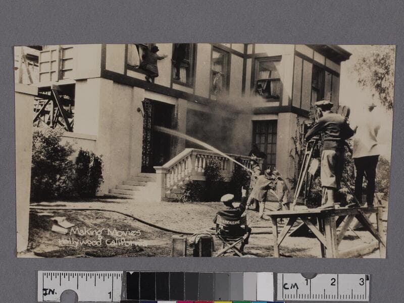 Image of a production crew filming a scene in Hollywood, California, with actors Dick Powell and Ruby Keeler posing on the grass outdoors.