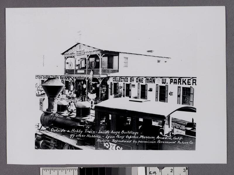 Outside a hobby train, Inside huge Buildings, 99 other Hobbies, Lyon Pony Express Museum, Arcadia, Calif