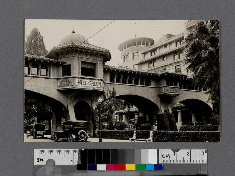 View looking north on Raymond Avenue at the Hotel Green complex, which comprised both buildings on either side of Raymond Avenue and walkway over the street.