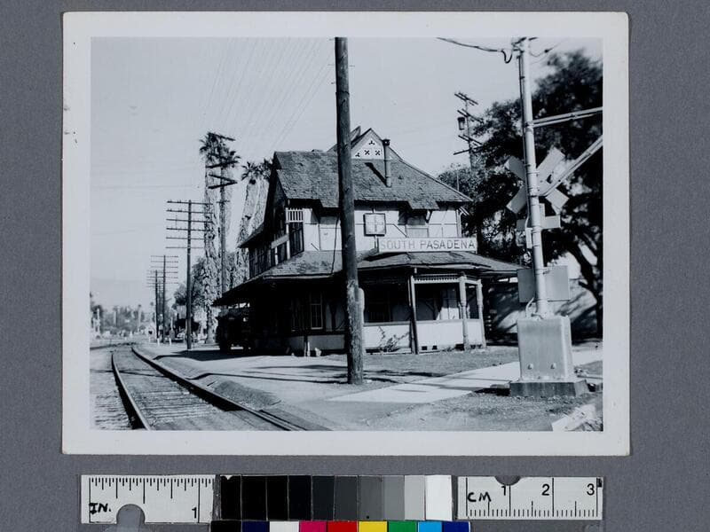 A series of three images showing a Union Pacific train at the "continuous rail" crossing in South Gate. The image on the left shows a crowd of onlookers at the South Gate station, watching as a train pulls in. The center image shows a crowd of people facing the last car of a train, with six men on the rear platform numbered in white ms. writing and identified below as "1. Senator W.J. Carr, State Railroad Commission ; 2. H.H. Whalen ; 3. Rex B. Goodcell ; 4. Governor C.C. [Clement Calhoun] Young ; 5. Mayor, John C. Porter ; 6. Elmer Snyder". Writing in white in the bottom left of the center image reads "Special Union Pacific Train, at first Official ; Demonstration of "Continuous Rail" crossing ; At South Gat [sic], California, Aug. 7th 1930." Writing in white in the bottom right corner of the center image reads "Photo By ; F.M. Huddleston". The image on the right shows a locomotive stopped at an intersection of rail lines, with a group of people standing around and looking at it.