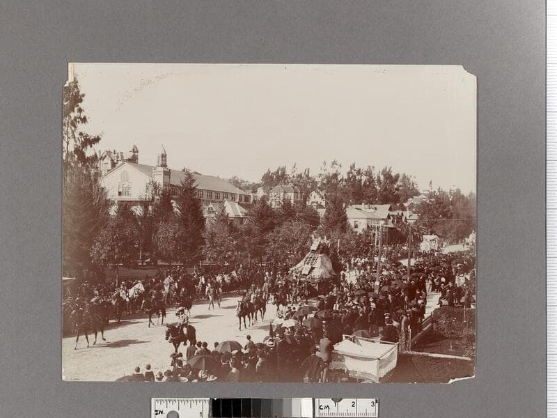 Parade with mountain railway float on Hill Street, Los Angeles