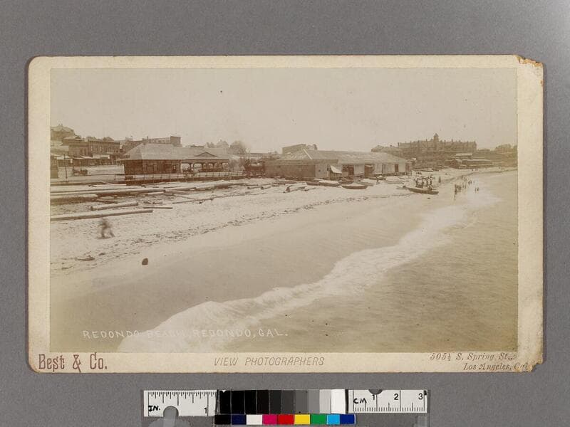 Image of a crowd of people gathered around a pagoda-style pavilion, with boats, and lumber on the beach and storefronts on Pacific Avenue for restaurants, boardinghouses, houses, and markets in the background in Redondo Beach, California. A passenger train depot for the Santa Fe Railway is visible on the beach at right, with the signs "Redondo" and "Santa Fe Route." Signs on the buildings include "Groceries, hardware, paints and oils, ship chandlery, gents furnishings goods, bathing suits, boots and shoes, fishing tackle," "Lunch Room," "Davis House," "Roach's Restaurant," "Seaside Market," and "W.A. Field."