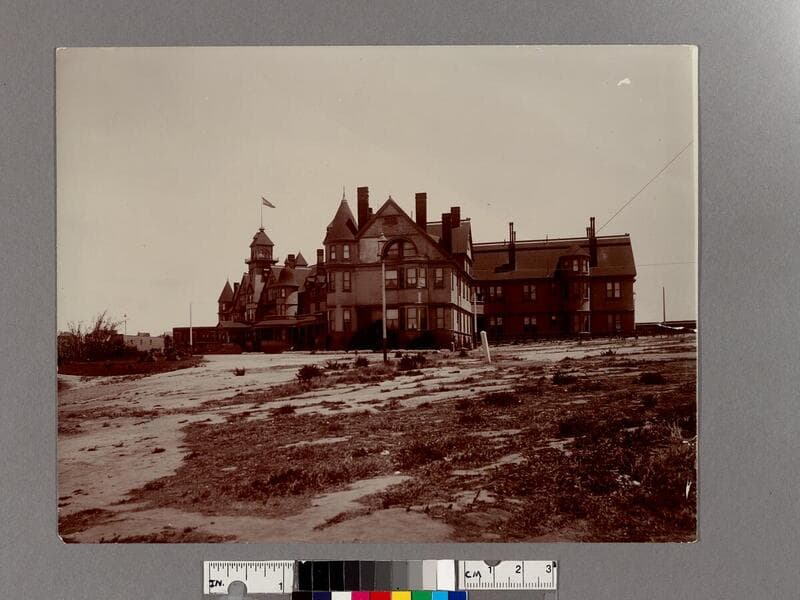 Image of people, boats, and lumber on the beach with the Redondo Beach Hotel (also known as Hotel Redondo), on the hill at right, and a restaurant, boardinghouse, and market on Pacific Avenue in the background in Redondo Beach, California. Signs on the buildings read "Casino" and "John Weilands lager draught." A passenger train depot for the Santa Fe Railway is visible on the beach at right, with a locomotive and signs "Redondo" and "Santa Fe Route."
