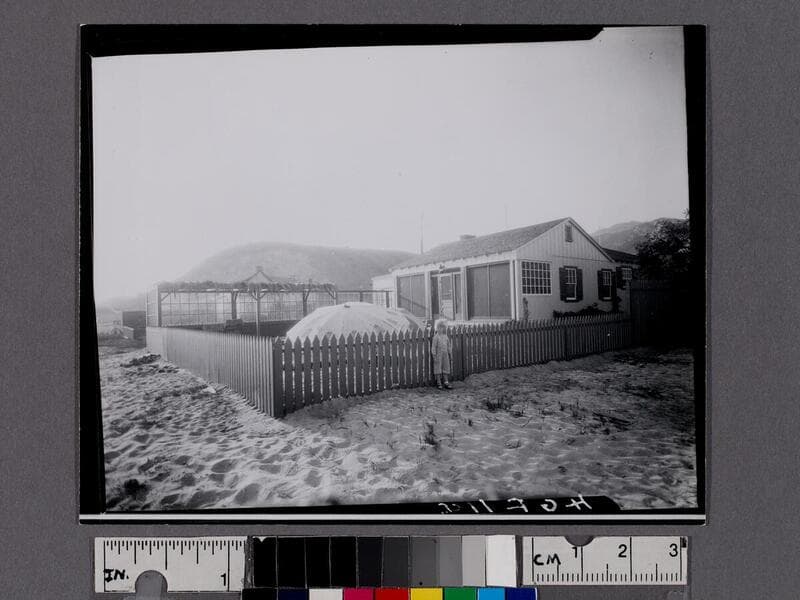 Image of the Malibu Movie Colony home of actress Betty Bronson on the beach in Malibu, California, with a picket fence and sign on post reading "Peter Pan's cottage."