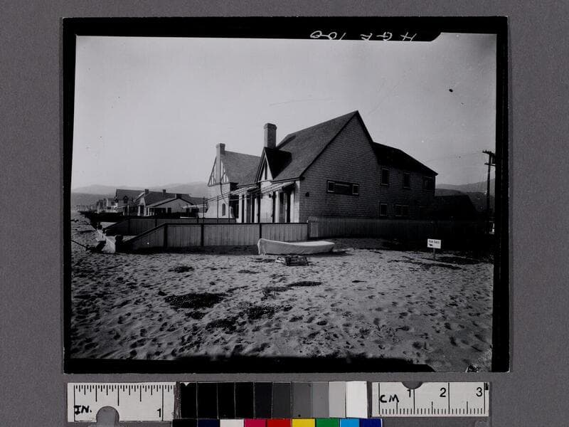 Image of the Malibu Movie Colony home of actress Betty Bronson on the beach in Malibu, California, with a picket fence and sign on post reading "Peter Pan's cottage."