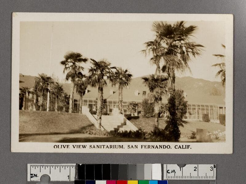 View of the exterior of a building at the Olive View Sanitarium in San Fernando (now part of Sylmar), California, with mountains in the background.