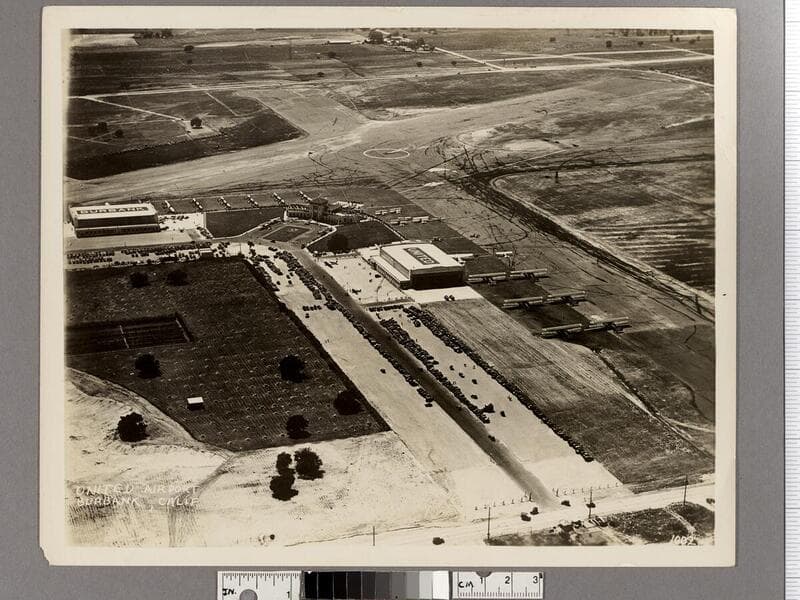 A slightly elevated panoramic view of runways at United Airport in Burbank. The photograph was probably taken from the top of one of the hangars. The Spanish-style terminal is at a distance, right of center, with the Pacific Air Transport building and a hangar to the right. The parking lot, which occupies much of the left side of the image, is filled with automobiles, and many of the people who are not seated on the grass facing the runway are on top of their vehicles. There is only on airplane parked in front of the terminal building, but a few others are visible beyond it. The finding aid describes these airplanes as "military airplanes". Writing in white in the bottom center reads "No. 7. Photo by ; F.M. Huddleston ; 4-26-1930".
