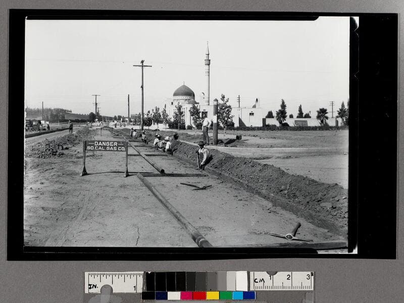 View of new community of Girard in the West San Fernando Valley. This location is now approximately where Topanga Canyon Blvd. and Ventura Blvd. meet, in Woodland Hills. View shows workers installing gas lines and rows of newly-planted trees.