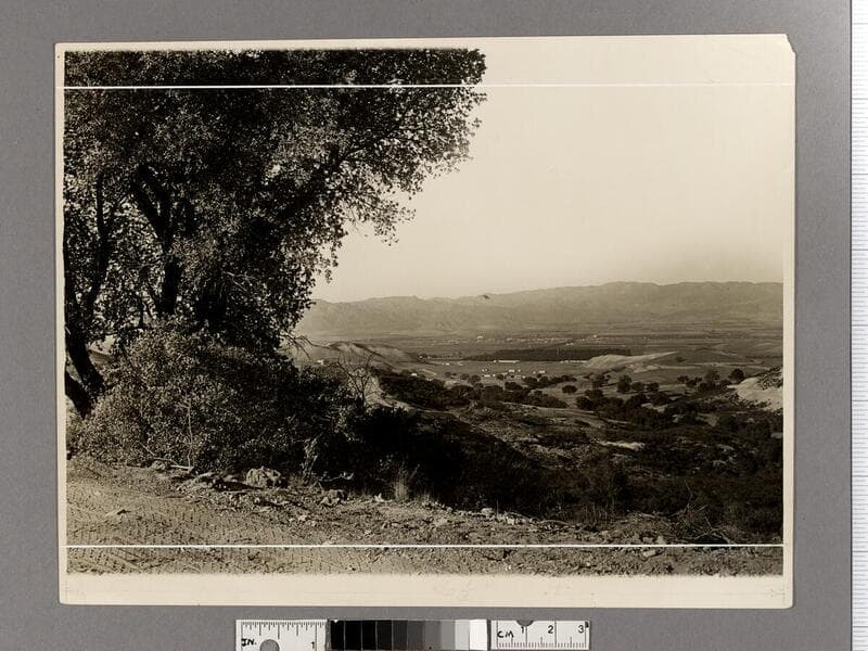 View of Girard and Owensmouth in the West San Fernando Valley, looking north from the summit of Topanga Canyon Highway. The canyon road leads to the San Fernando Valley, showing houses and trees in an open landscape. The town called Girard became present-day Woodland Hills.