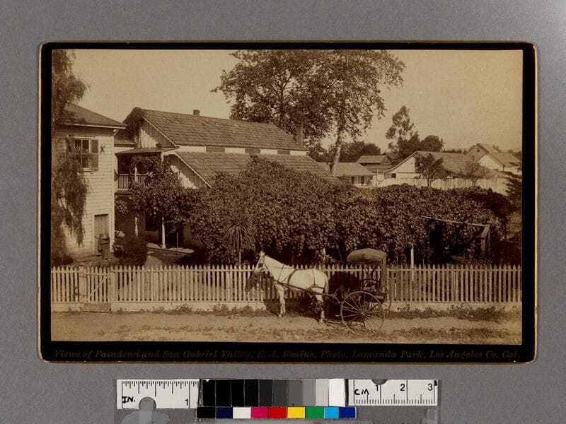 The two-story home of Nathaniel C. Carter on his Willow Dale estate in San Gabriel (now San Marino, California), with a long porch and a garden bordered with a picket fence and rows of grape vines in front of it. A man and a woman stand on porch, a woman on horseback is near the side of house, and a cat rests near the driveway.