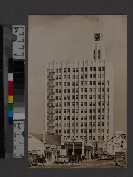 Image of the intersection of Second Street and Arizona Avenue in Santa Monica, California, with the Bay Cities Guaranty Clock Tower building (Clock Tower Building or Crocker Bank Building) in the background. Signs on surrounding buildings read "Mobilegas," and "Southern Pacific Travel Office."