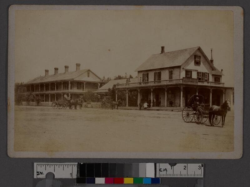 A view of the Santa Monica Hotel with dirt roads and horse and horse-drawn buggy in front in Santa Monica, California.