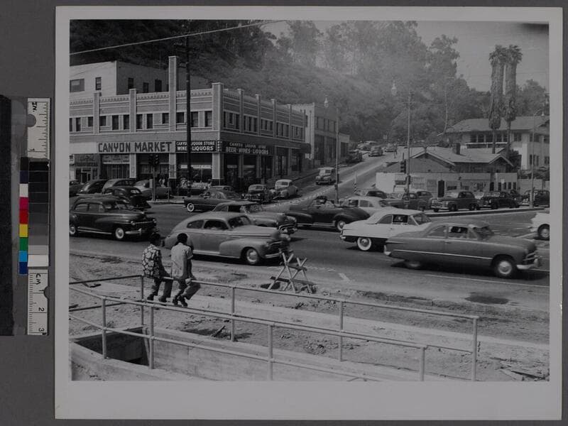 Image of a few automobiles at the intersection of Pacific Coast Highway, Chautauqua Boulevard, and Channel Road, in Santa Monica, California. Some storefront signs read "Dehn's popcorn peanuts shoppe" and "Bathhouse."