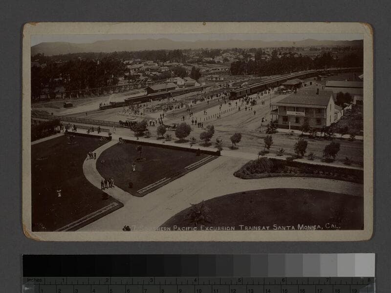 Image of the Southern Pacific railway station and grounds with an "SP" topiary arrangement in center in Santa Monica, California, near the Arcadia Hotel. Freight railroad cars in the foreground have lettering that reads "Central Pacific Ogden" and "S.P 72479," and a passenger train is visible in the background.