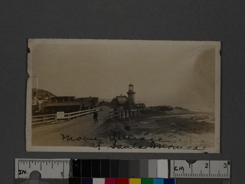 Image of sets and buildings of the Inceville movie studio on the beach at Santa Monica Canyon in Pacific Palisades in Santa Monica, California.