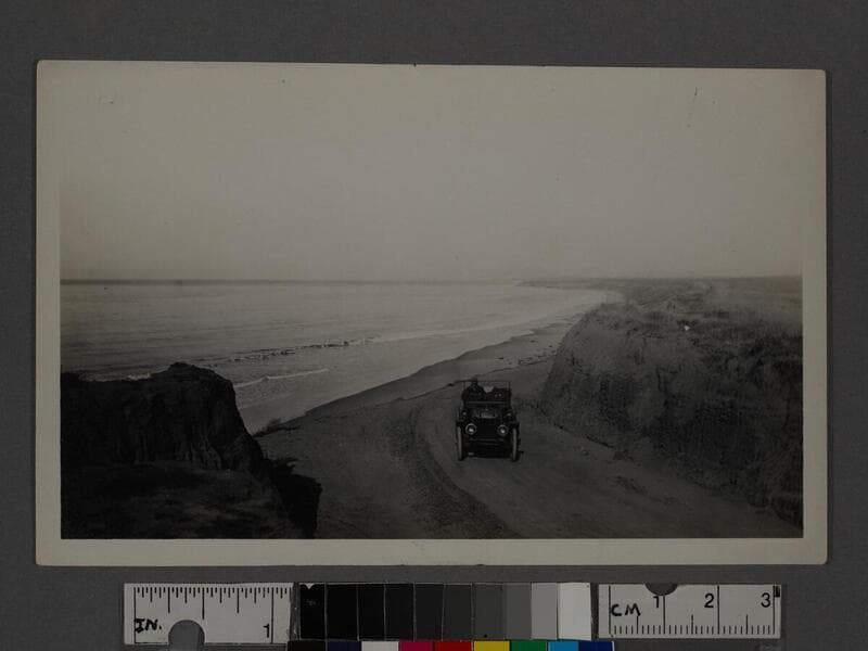 Image of a beach with cabins and automobiles lined along the Beach Road near Santa Monica, California (presumably around Malibu). People can be seen on the beach and in the water.