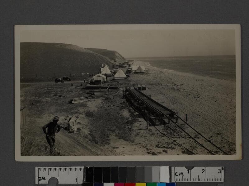 View of a railroad trestle bridge for the Rindge railway (incorporated as the Hueneme, Malibu and Port Los Angeles Railway) in Malibu, California.