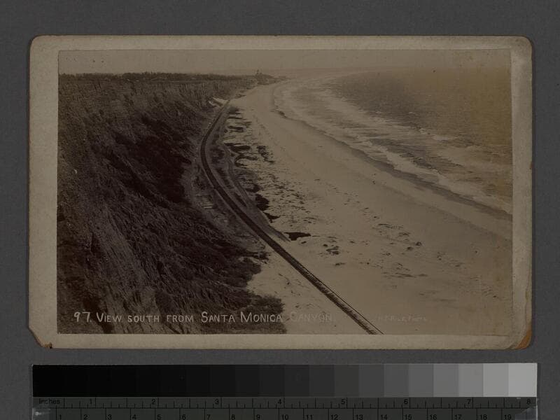 Image of North Beach and the Arcadia Hotel with the Southern Pacific Railroad tracks running next to the Beach Road in Santa Monica, California, in 1893. The Santa Monica Bath House and the remains of the Los Angeles and Independence Wharf are visible at right and the Palisades Bluffs are visible at left.