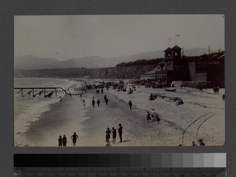 Image of people in front of the North Beach Bath House dressed in clothes and bathing suits on the beach in Santa Monica, California. A pipe transporting seawater to the warm salt water plunge is seen at left and two water towers and band shell can be seen above the bluffs.