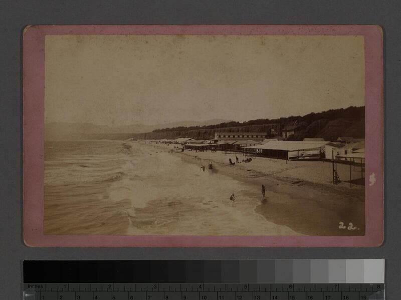 Image of people on the beach and in the surf in front of the Santa Monica Bath House in Santa Monica, California, with trees on the bluffs above.