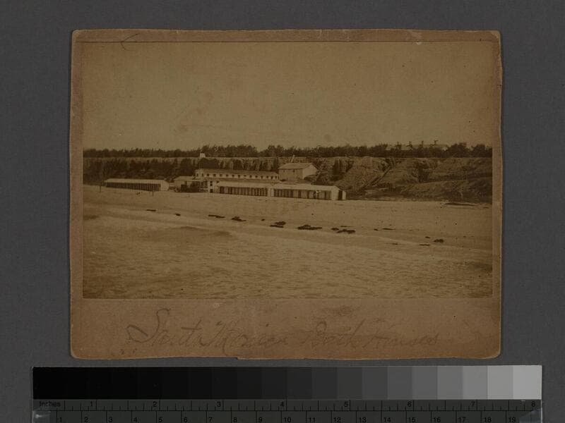 Image of people on the beach in front of the Santa Monica Bath House and Michael Duffy's Bath House (two long one-story buildings at right of the two-story Santa Monica Bath House) in Santa Monica, California, with the Santa Monica Hotel on the bluffs at right and the Ocean House on the bluffs among the trees at far left.