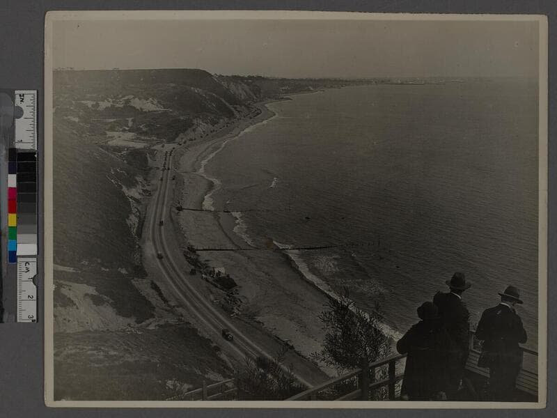 Elevated view of the Roosevelt Highway (later Pacific Coast Highway), Santa Monica Bay, and coastline with the Lighthouse Bathhouse on the beach next to the remains of the Long Wharf stone jetty in Pacific Palisades, California. The Santa Monica Pier can be seen in the distance at upper left center. A sign for "Huntington Palisades" is seen at left edge of image.